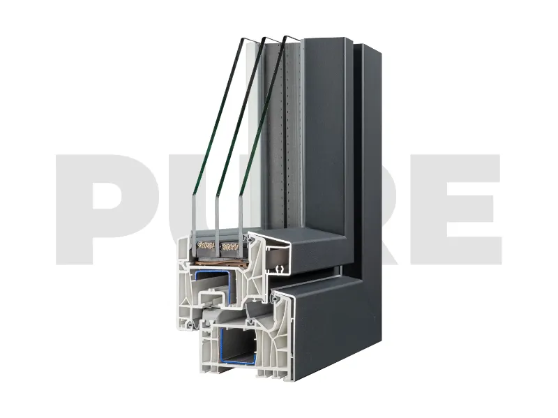 A Pure műanyag Schüco ablakrendszerek a 82 mm-es beépítési mélységének és a legmagasabb 7 kamrás tok és szárnykialakításnak köszönhetően a hőszigetelés királyai. Nem csak egyedi megjelenés jellemzi, hanem a legmagasabb hő és hangszigetelés is elérhető általa, üvegezéstől függően. Az alumínium klipsz nagy ellenállóképességet tesz lehetővé a külső behatások ellen, valamint védi a profilt az erős napsugárzástól, mellyel javul a hőszigetelő képessége is.